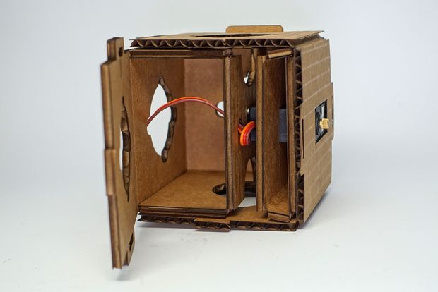 Paper clips are used to secure the servo horn to interface with the cardboard.