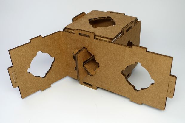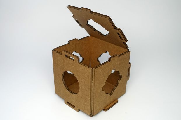 Friction fit the 2 small rectangle keys together, then insert them into the circle (flower shape), where there are 4 little notches. Inset then turn 45 degree. This would fraction fit together 2 pieces of cardboard.