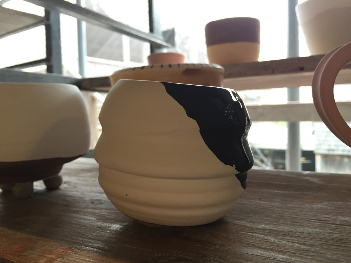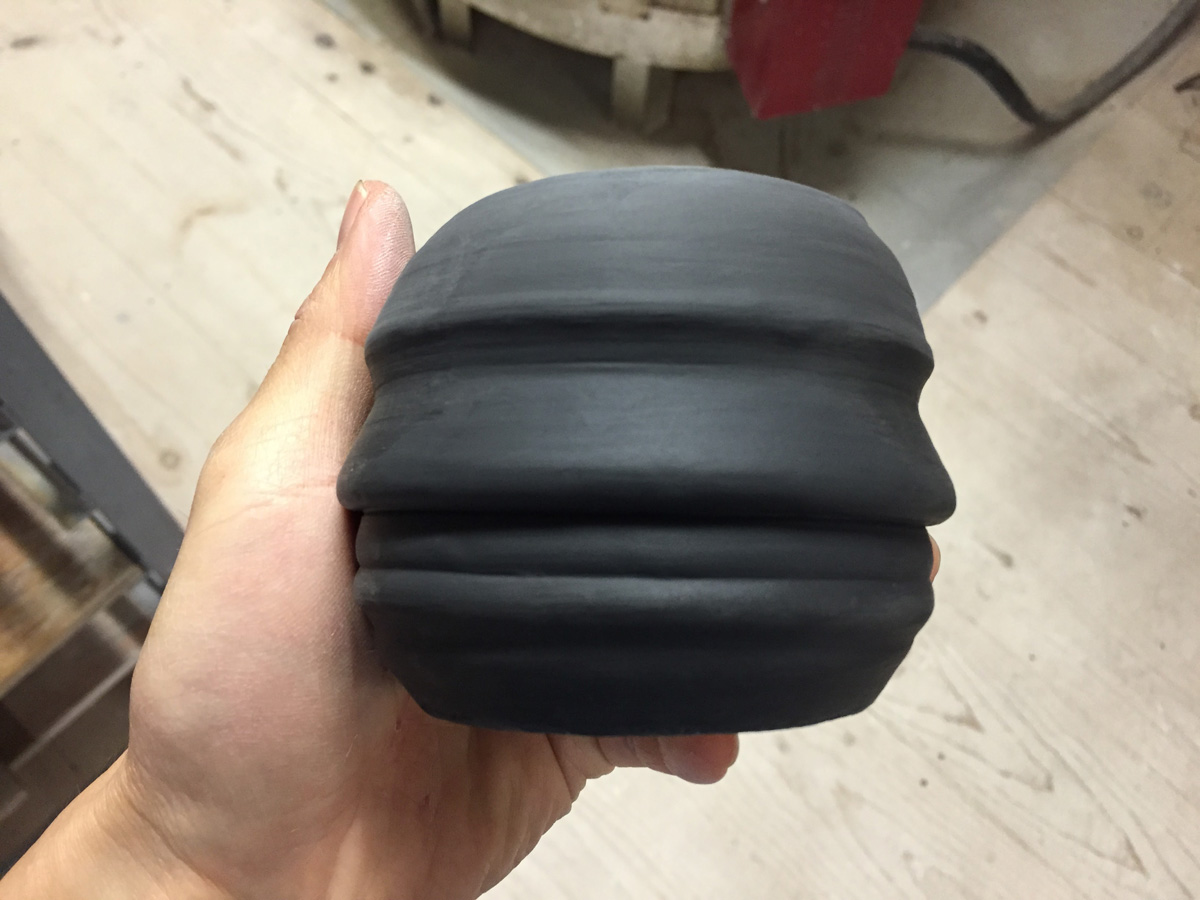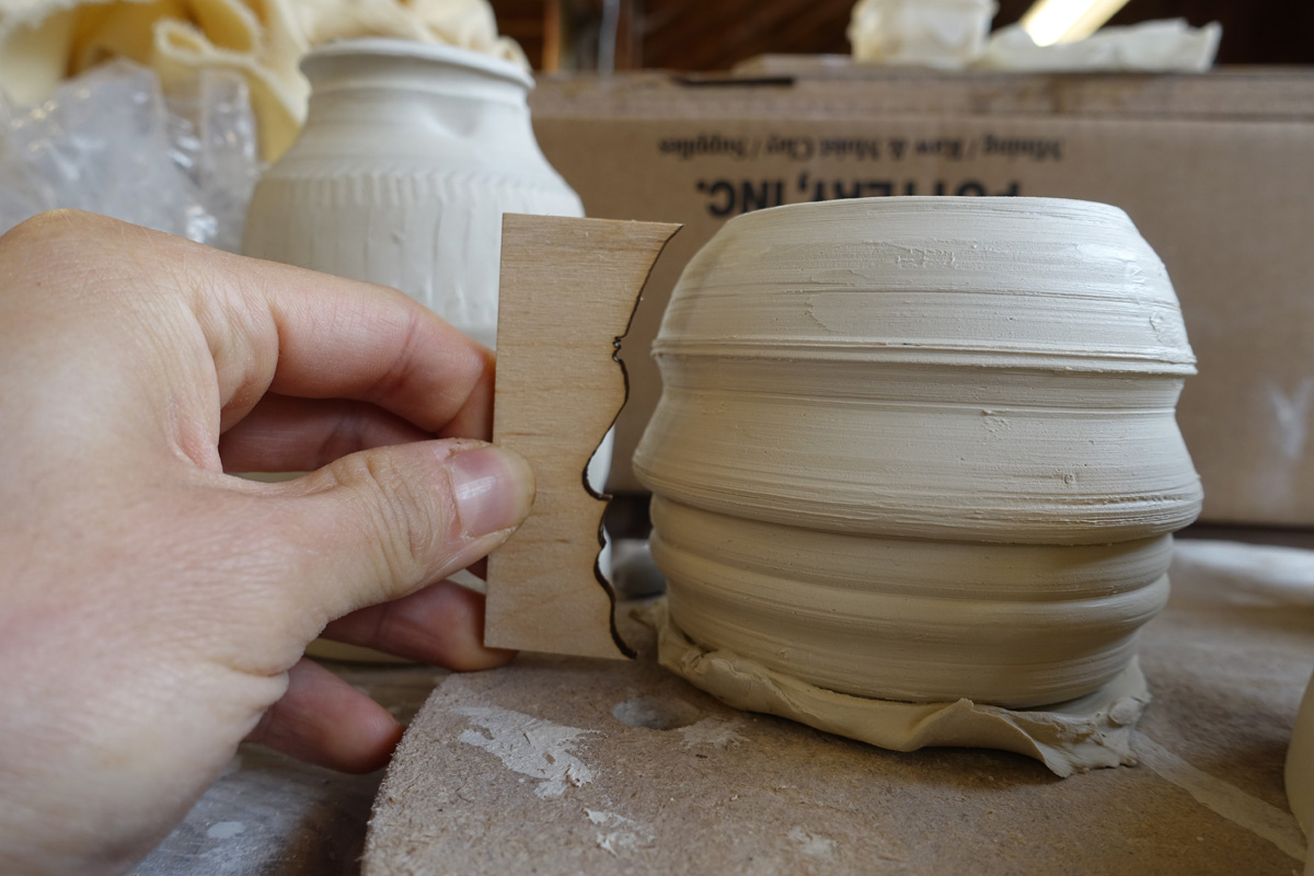 Like making any other mugs on the potter’s wheel, we center our clay, open then pull upwards. The only difference is that we want the walls to be thicker so we can scrape off the clay on the outside wall to create the profile.